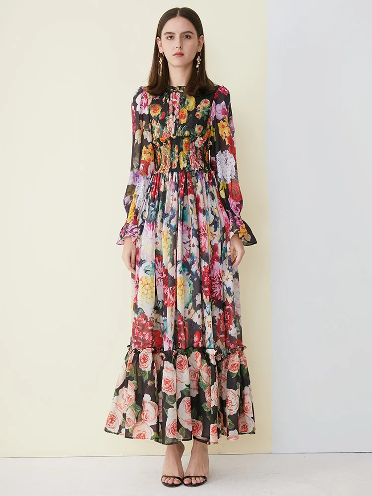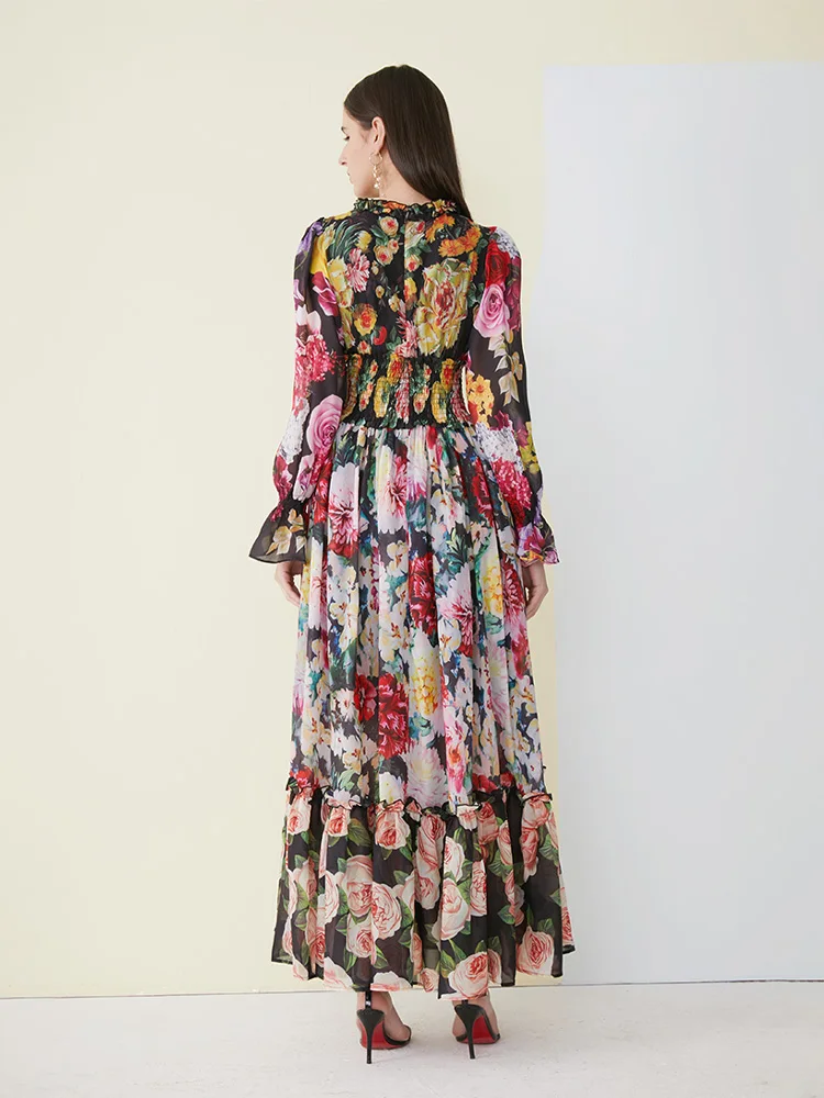 Ladies Elegant Floral Print Long Sleeve Dress Summer Beach Chiffon Ruffled Collar Dress Elegant Elasticity Waist A-Line Sundress