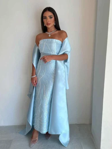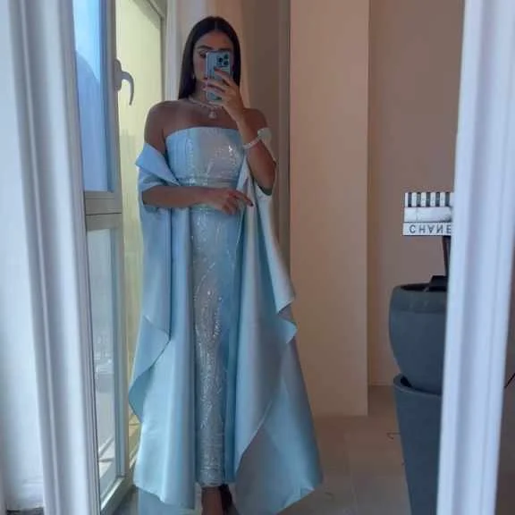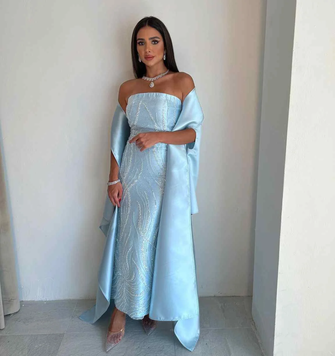 Saudi Arabia Long Sleeves Formal Women Prom Dresses V Neck Beadings Floor Length Slit Sky Blue Evening Gowns Wedding Party Dress