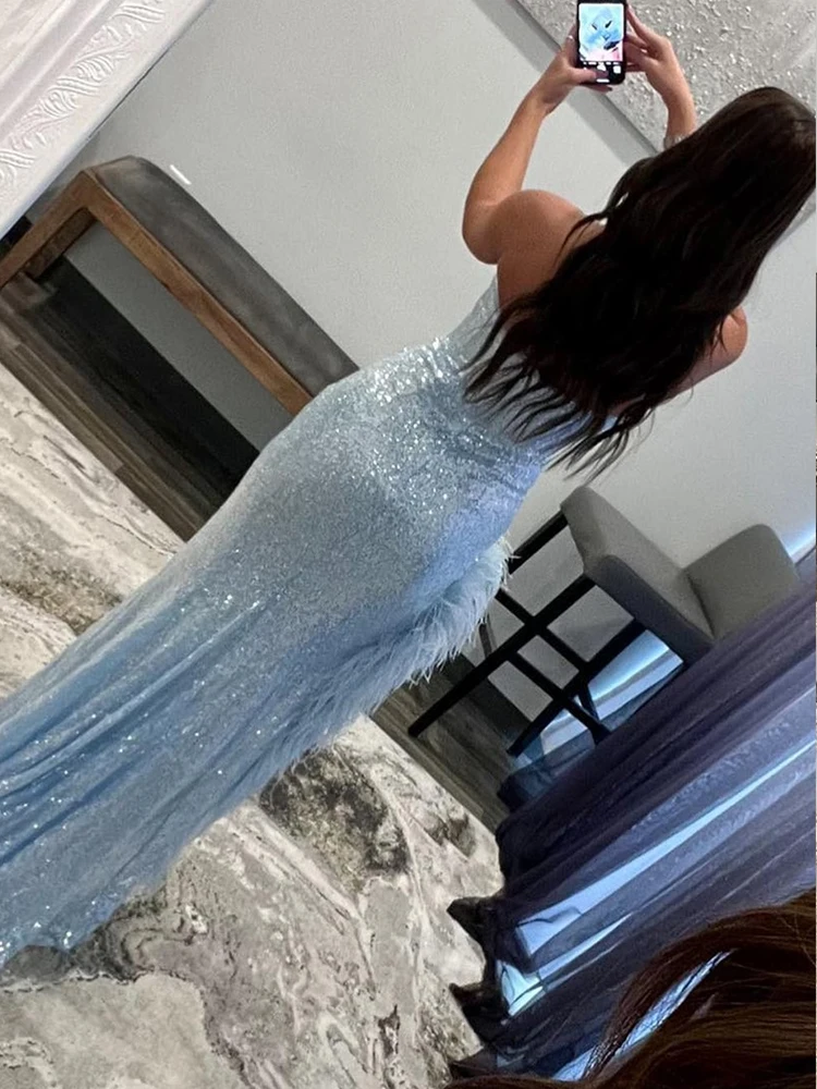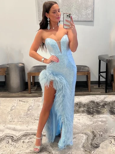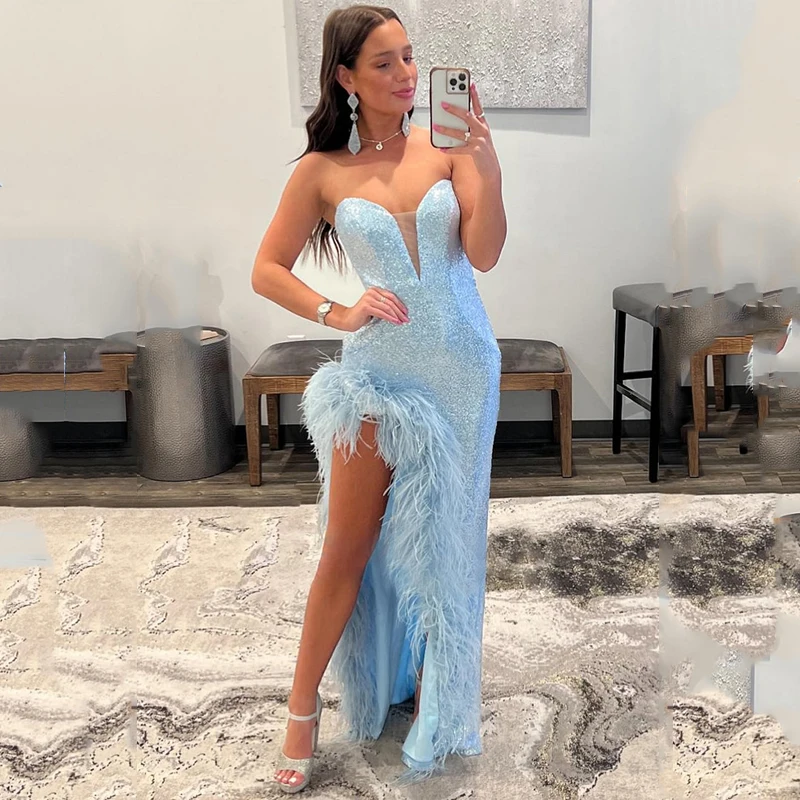 VENUS Sexy Deep V Neck Prom Gown For Women A-Line Formal Dress Sparkly Sequined Evening Dress Open Leg Party Dress With Feathers