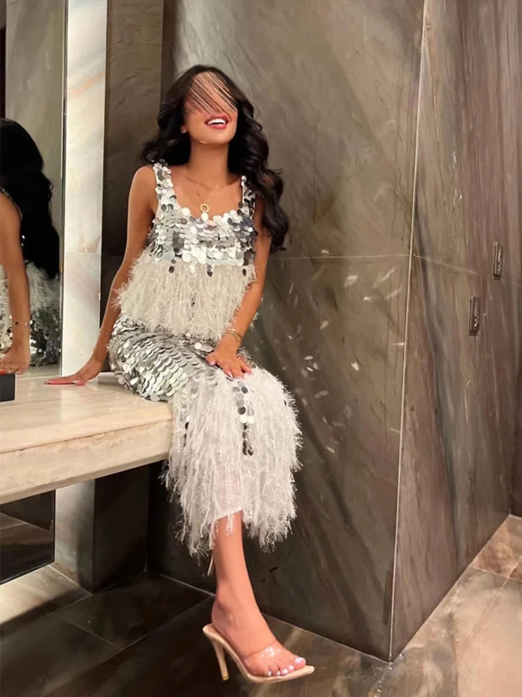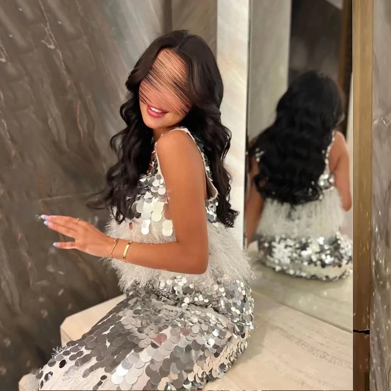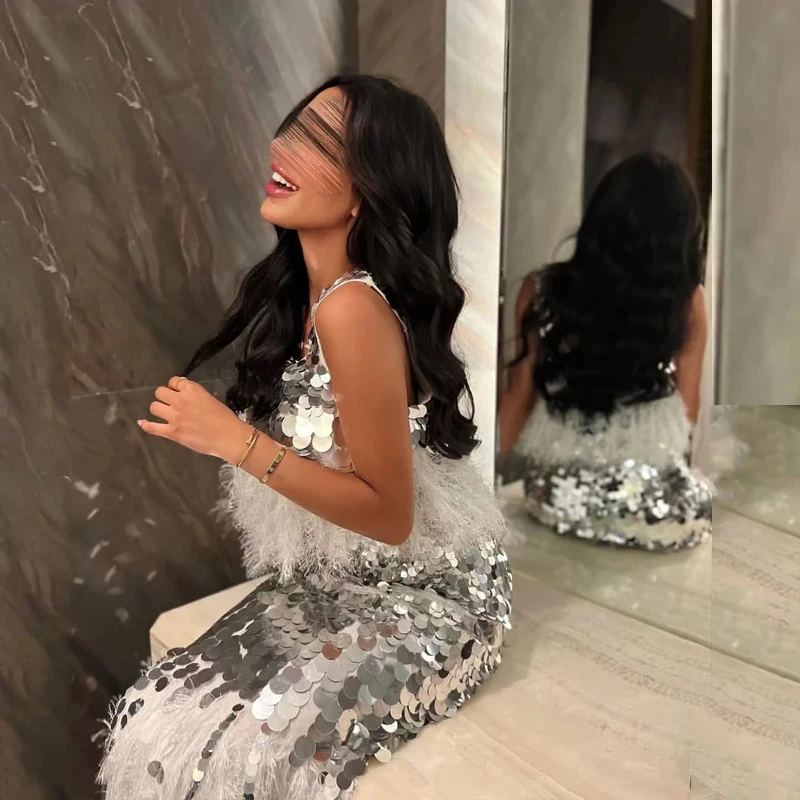 VENUS Square Collar Neck Prom Dresses Mermaid Sparkly Sequined Formal Dresses Tea-Length Evening Dress Feathers Party Dress